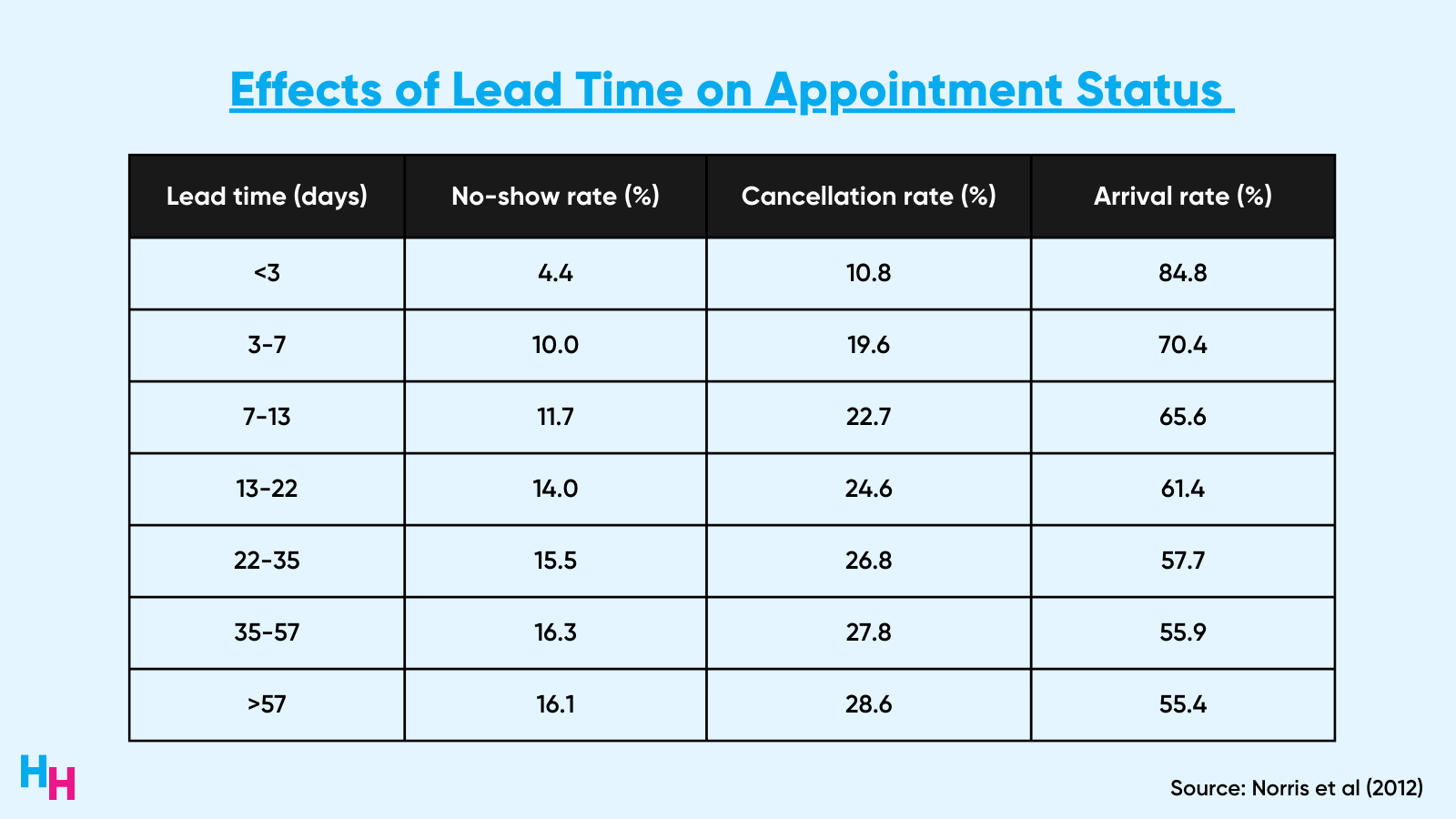 The irony is that there’s a positive correlation between cancellations/no-shows and lengthy lead times. That is, offices that schedule patients far in advance to fill future slots are actually doing a disservice because longer lead times increase the chances of no-shows and cancellations. For example, a lead time of over 55 days results in a 16% no-show rate and 29% cancellation rate.