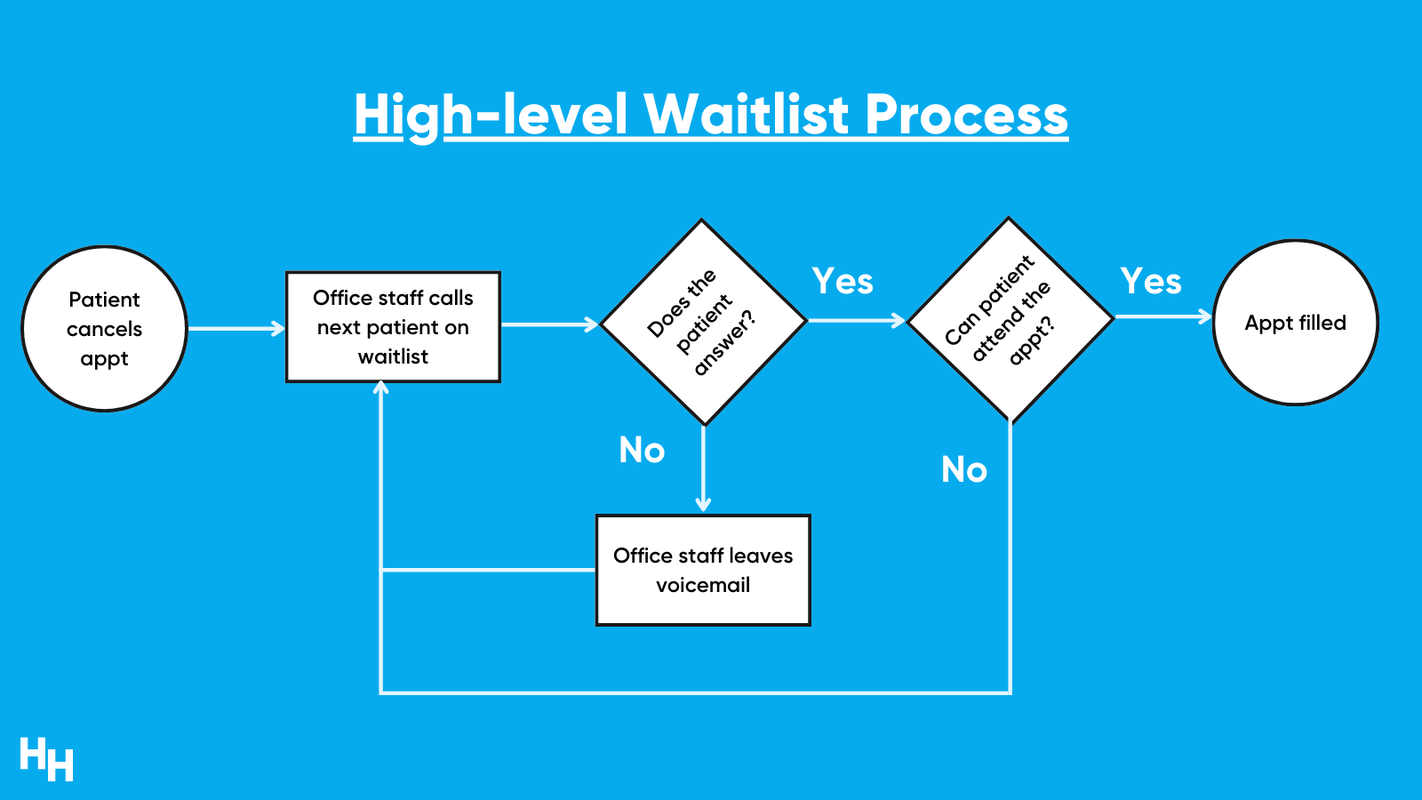 Jonny and I interviewed dozens of specialty practices, ranging from dermatology to ENT, to better understand their scheduling processes. The lead times ranged from two weeks to six months and each office reported that daily no-shows and cancellations were the norms. When we asked how they deal with patients wanting earlier appointments, they said they maintain a waitlist.