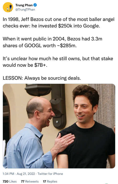 The Acquired podcast recently did a fantastic breakdown of Amazon and Trung pulled out this incredible story of how Bezos first became a millionaire. It wasn’t from Amazon, it was from a $250,000 investment in Google.