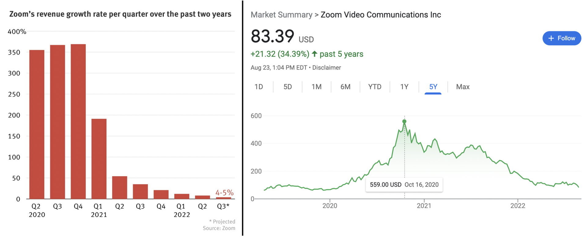 On the left, a graph of Zoom's growth rate which plumetted from 350% a quarter in 2020 to 4% in Q3 2022, per The Information. On the right, the stock. Zoom 2.0