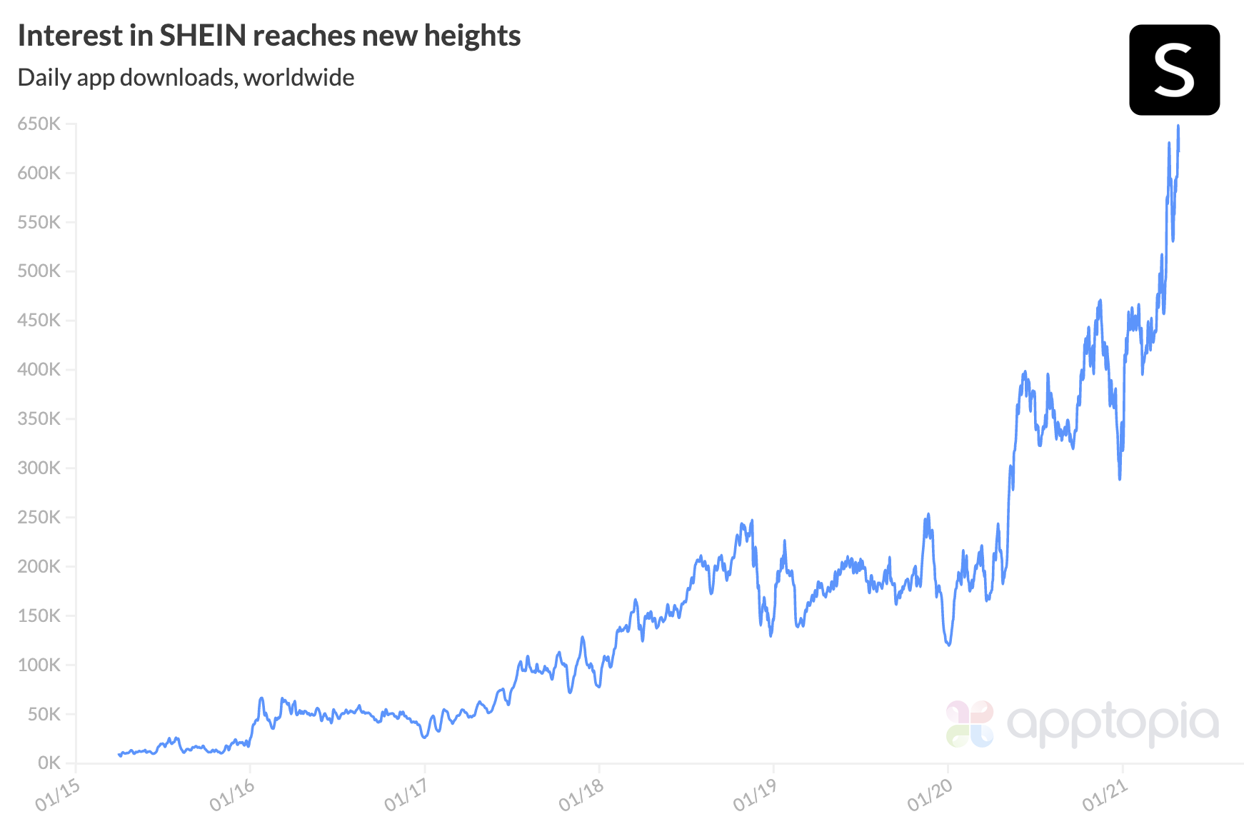 SHEIN’s daily app downloads through 2021. From Apptopia.