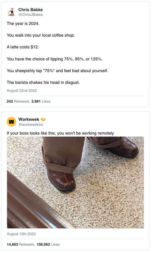 Chris nails it with this next tweet. I’m seeing a lot of 30% tip options at coffee shops now. Listen, I happily tip a minimum of 20% for any sit-down restaurant…but a default 30% for a take-out coffee is wild. |
