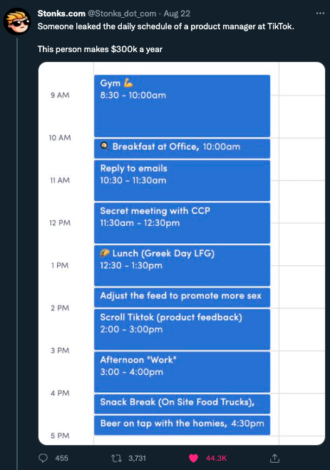 PLUS: Some smart links (why Harvard’s $53B endowment may lose its crown) and really dumb memes (the daily schedule for a product manager at TikTok) |