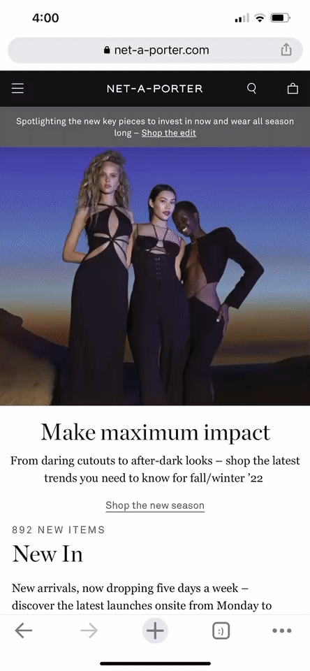 Net-a-Porter preferred to show me an uninterrupted party trick. (The hero gif where the sun is setting behind the models). They chose to highlight their perfect, artistic scene, and to set the sun on CRO.