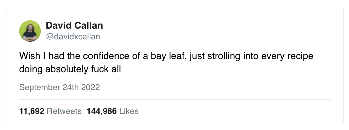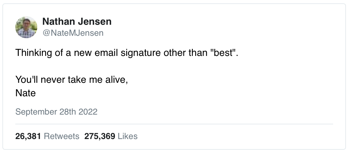 Based on this next tweet, I’m considering updating my email signature to “what we do in life, echoes in eternity” (IYKYK). |