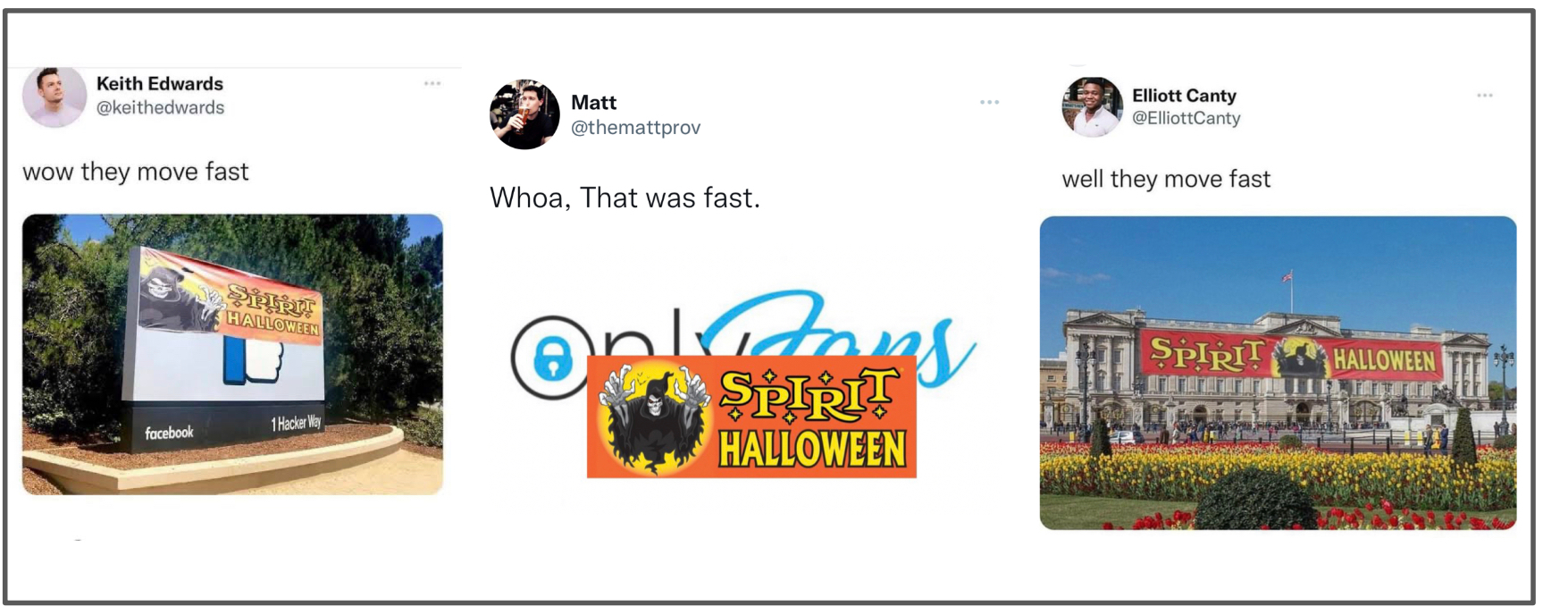 Anytime an organization is going through a perceived failure or hard time, someone on Twitter will post a photo of the Spirit Halloween banner photoshopped over the ailing organization with the caption “wow, they move fast” or “whoa they move fast”.