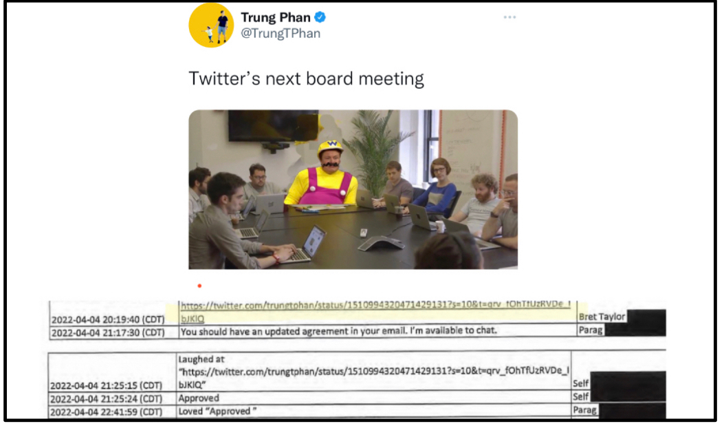 One text exchange really caught my eye…because it included a meme I made: On April 4th — before Twitter announced that Elon was joining its board (he declined it a few days later) — Twitter Chairman (and Salesforce co-CEO) Bret Taylor sent my joke tweet (of Elon as Wario from his SNL skit) in a three-way chat between himself, Elon and Agrawal.