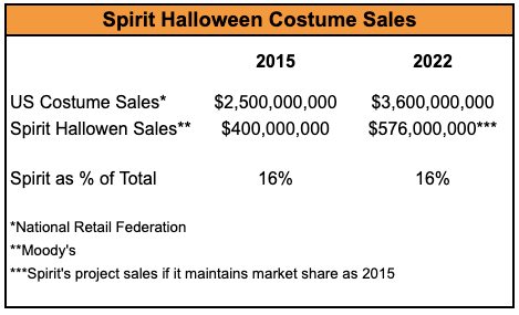 At the same share of total Halloween costume spend, Spirit’s sales would hit $576m in 2022…which is probably conservative because Spirit’s footprint has since increased and people are about to do some ridiculous revenge Halloween-ing this year. |