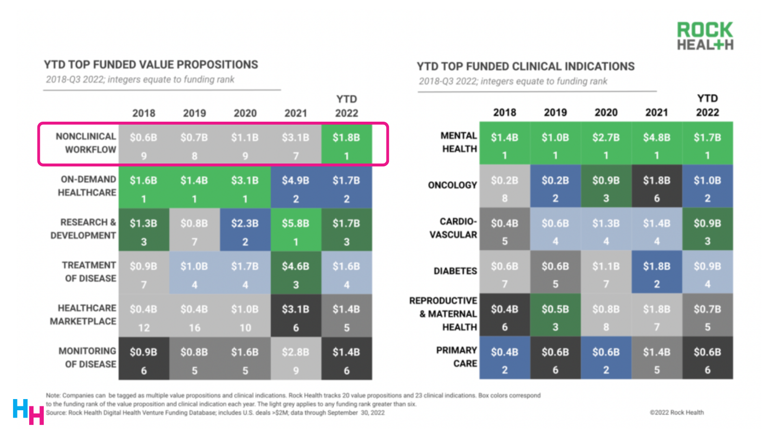 Clinical and nonclinical workflow companies are perhaps more scalable than, let’s say, mental health companies. The main reason is digital mental health companies require mental health providers to provide their services through the companies’ tech-enabled services. Mental health providers are a hot commodity since there are not many of them. Workflow companies, however, don’t require providers as a means to deliver their services. Therefore, workflow companies can quickly establish their technology in private practices or health systems, improve workflows, and scale from there.