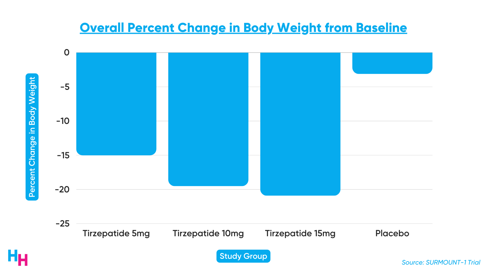 Results from the SURMOUNT-1 clinical trial are promising. SURMOUNT-1 was a 72-week-long Phase III, double-blind, randomized control trial, including 2,500 participants with a BMI over 30, or 27 with more than one weight-related comorbidity that’s not type 2 diabetes. At the end of the 72-week study period, participants’ body weight decreased on average by 16% in the low-dose group, 21% in the medium-dose group and 23% in the high-dose group. Those in the placebo group only lost 2% of their body weight.