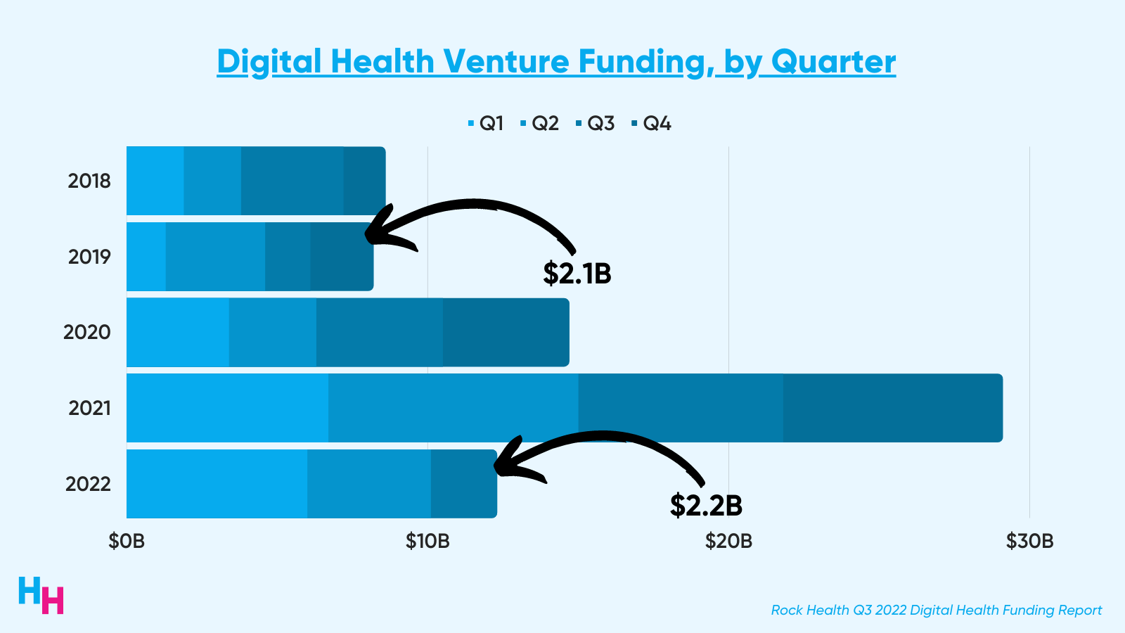 Given the year’s choppy venture waters and public market correction, investors are holding back from the market, waiting to strike once things stabilize. — Rock Health |