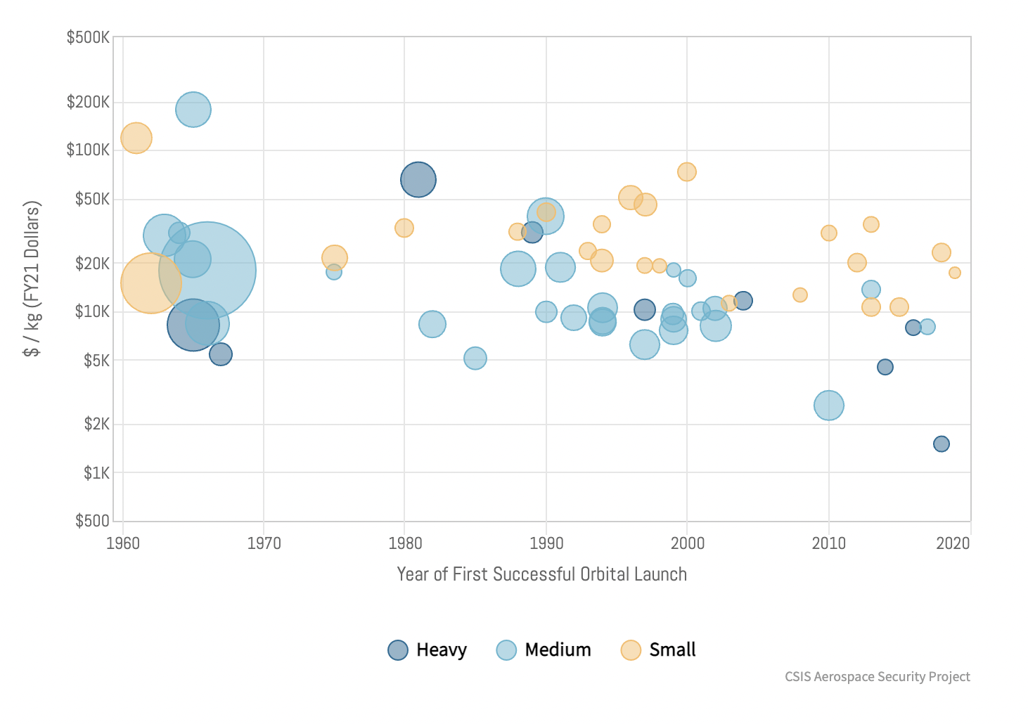 Fantastic graph from Aerospace.org mapping the costs of launching rockets into space. Those two blue circles in the bottom right corner are SpaceX’s Falcon 9 and Falcon Heavy. |