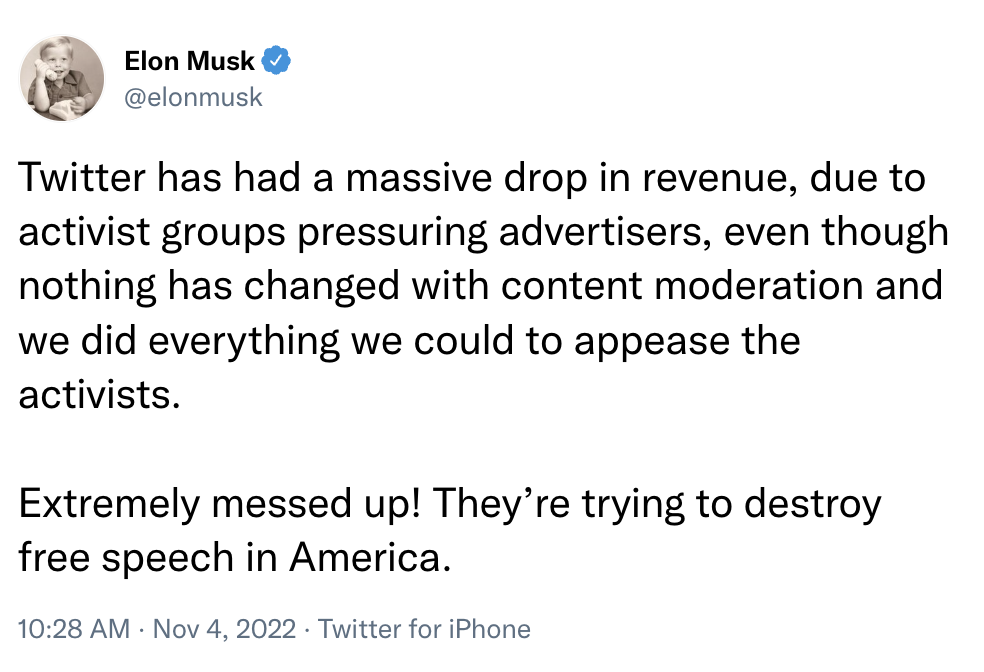 Both sides have a point but the more interesting point is the tangible impact it’s already having on Twitter’s financials. Earlier today, Elon confirmed rumors that spooked advertisers are leaving the platform en masse. |