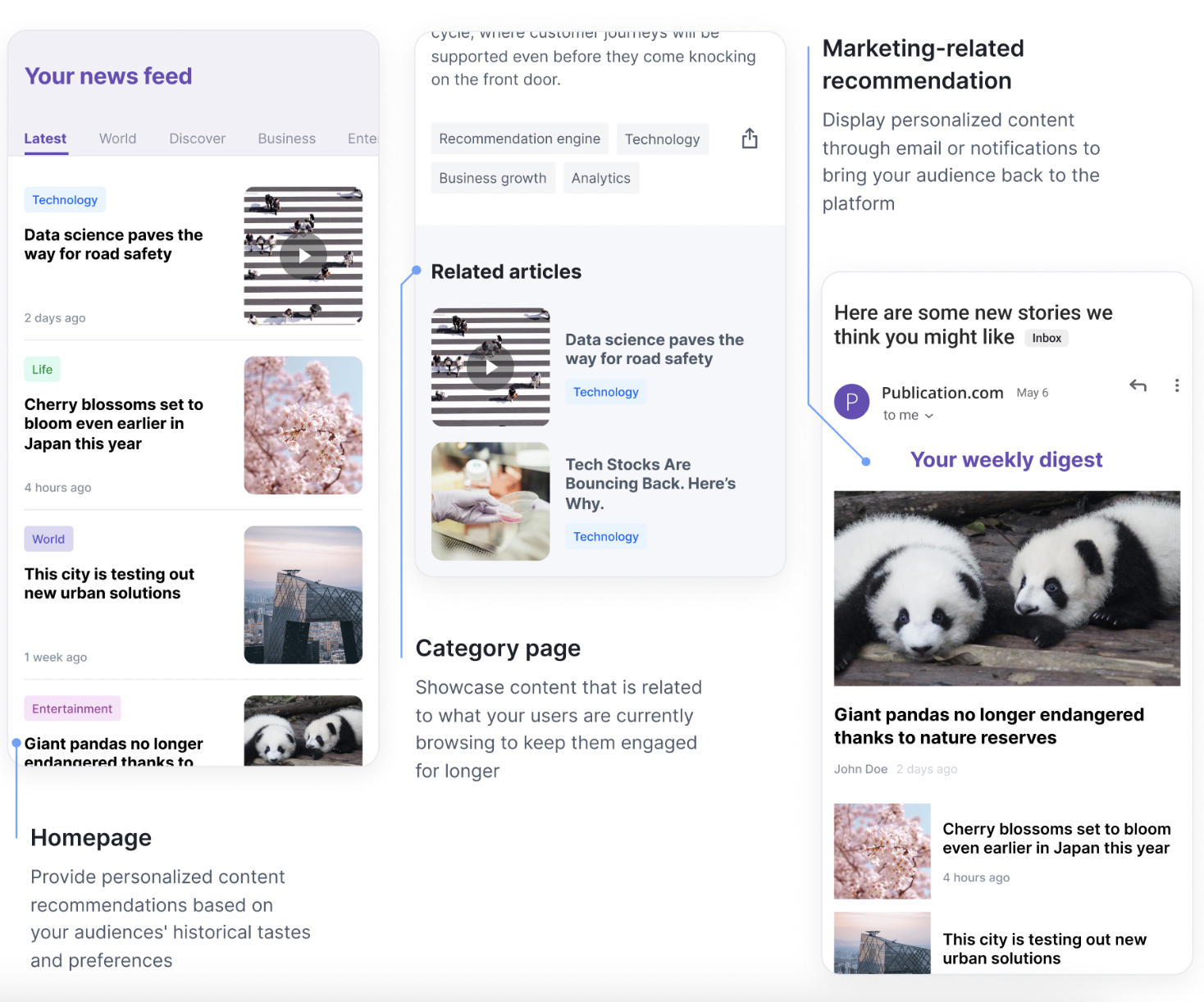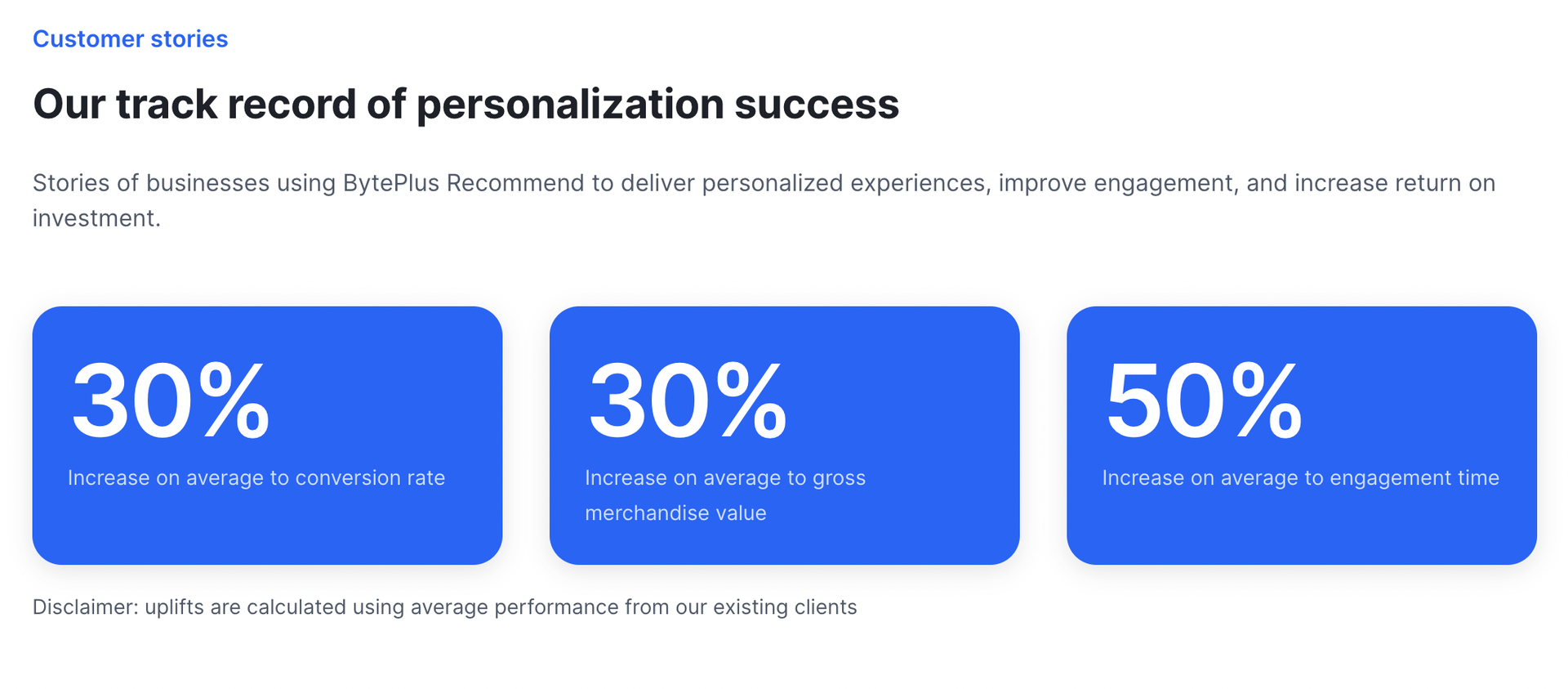 BytePlus is the TikTok algorithm packaged and delivered for your business. You share your user data and behavior with the BytePlus API and in exchange you get TikTok quality recommendations. A few examples from the landing page: |
