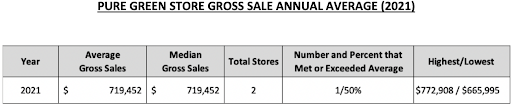There were 2 Pure Green Outlets that were open for the full calendar year (1 franchise outlet and 1 corporate-owned outlet) in 2021. The Average Gross Revenues of the two outlets are listed below.