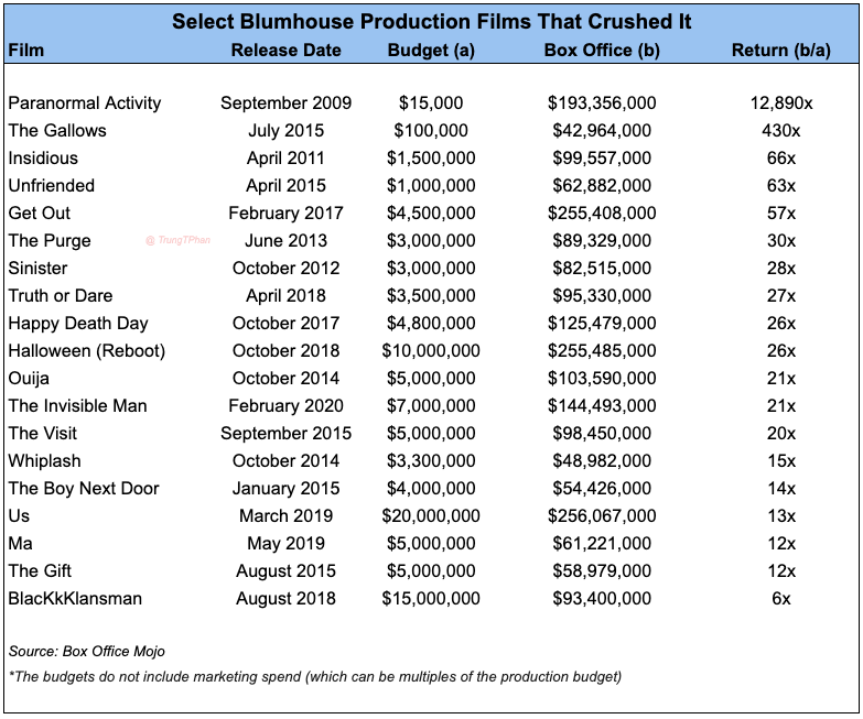 Either way, I can appreciate an outrageous investment track record and Blumhouse films regularly post double-digit returns on the production budget. The biggest home run was Paranormal Activity, likely the most profitable film ever on a return basis. Made on an original budget of $15,000 — which jumped to $18m+ when re-shoots and marketing were included — the film grossed $193m worldwide.