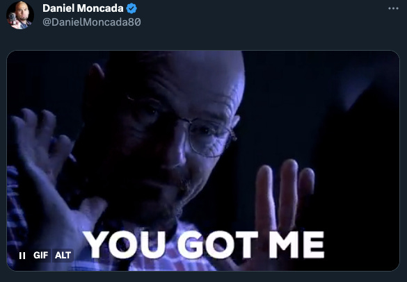 The payoff: Back to Breaking Bad. It is one of the greatest TV shows ever and also one of the greatest sources of internet memes, which leads to an amazing finale: Daniel Moncada — one of the twin brothers — replies to the thread with a meme from the show that confirms that the brothers are colluding and using the concept of “anchoring” to great effect (the first time I read the thread, I legit LOL'd).