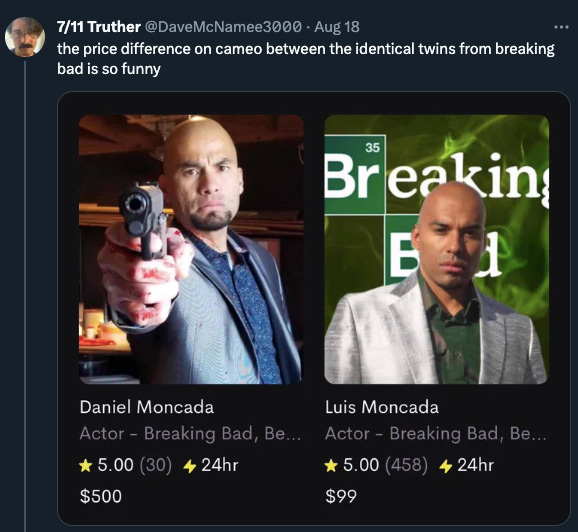 Finally, one of the funniest X/Twitter interactions I’ve ever seen (and something that can truly only happen on X/Twitter). The setup: In the show Breaking Bad, there are twins that play cartel hitmen. The actors are brothers in real life (Daniel Moncada, Luis Moncada). They both have profiles on Cameo, the platform where users pay celebrities for shoutouts. Someone on Twitter found their profiles and posted this: