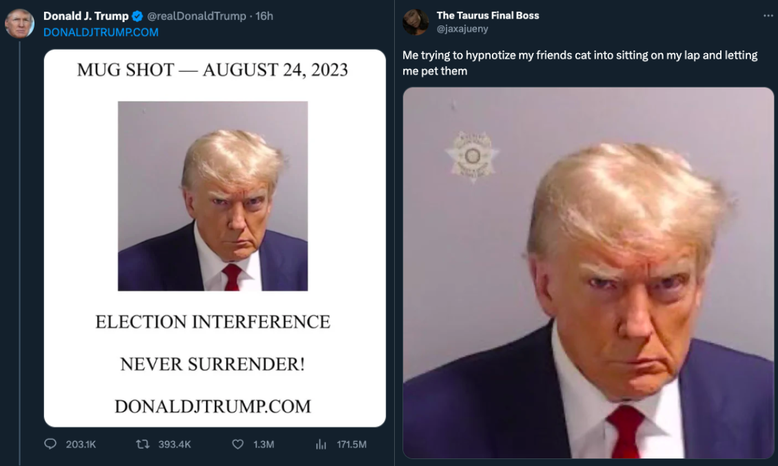 At this point, you probably saw the mugshot of Donald Trump. He tweeted the image out (his first post in over two years). And the memes have been wild: |