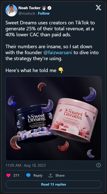 The good thing is, these don’t have to be highly complex, bespoke graphic assets. I’m pretty sure Noah just used standard product shots, and a headshot of the founder for one of the images. And there’s one tweet with a TikTok screenshot.