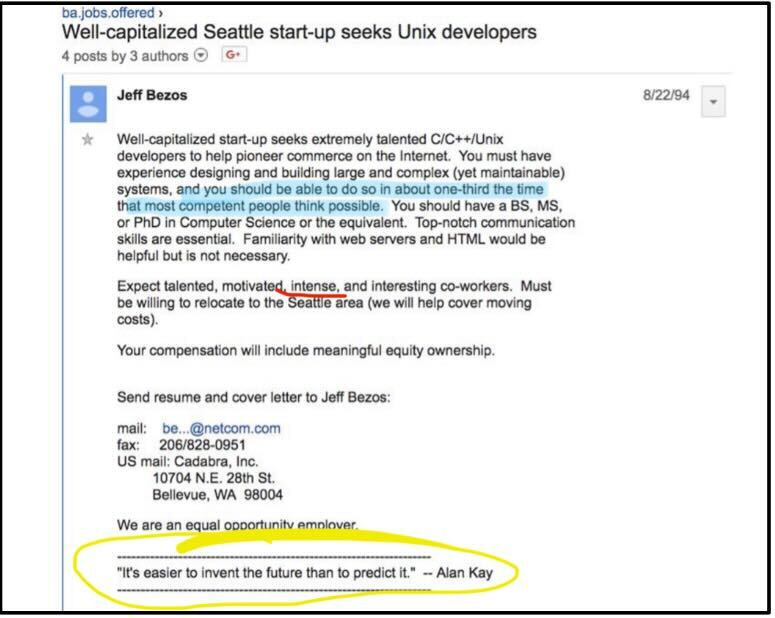 On August 22nd, 1994, Jeff Bezos posted the first job listing for Amazon (which was originally called Cadabra; as in abracadabra). The header reads “Well-capitalized Seattle start-up seeks Unix developers”. |