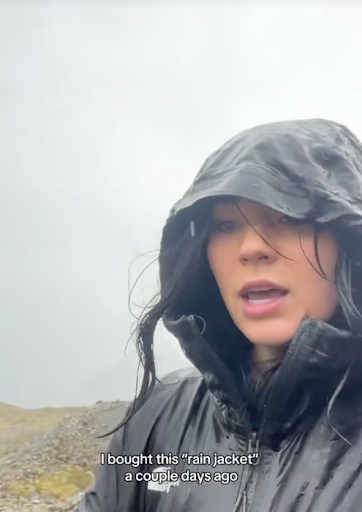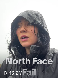 Well in this video Jenn is candidly describing how her “waterproof” North Face jacket had her walking around like a “drowned rat” and that she didn’t want a refund but instead wanted express delivery of a new and improved jacket to her exact location in the mountains. (Here’s the video.)