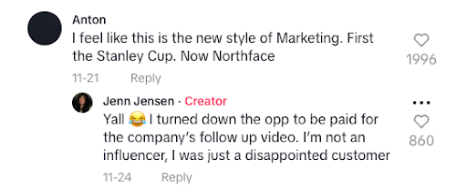 Two, Jenn publicly expressed distaste about The North Face’s waterproof jacket and publicly denied the offer to receive any money from the mishap, so consumers know that she is honest and never been in it for financial reasons.