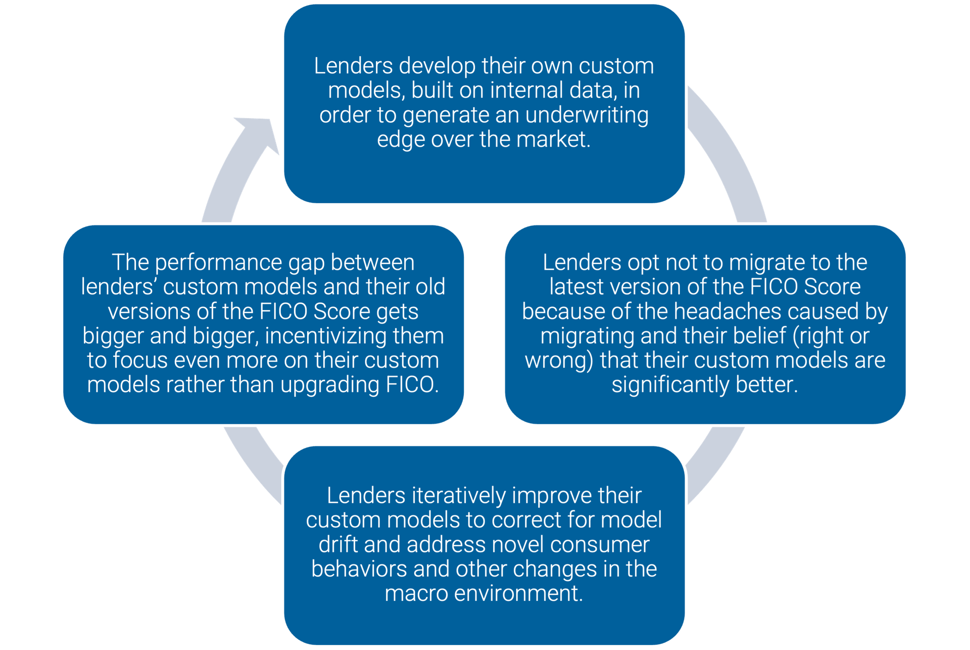 All predictive models become less useful over time. It’s inevitable. Consumer behavior changes, often in response to unforeseeable macro events or new technology. For example, when online lending started to really boom in the U.S. in the middle of the 2010s, lenders noticed that consumers’ credit scores were seeing these weird boosts that weren’t actually indicative of improved credit performance. It turns out that consumers were using those personal loans from digital non-bank lenders to refinance and pay down their revolving credit card debt, which would temporarily spike those consumers’ credit scores (lower utilization!) before they would load back up on more credit card debt. The FICO Score was fluctuating in ways that were confusing to lenders because of consumer behavior that emerged after FICO developed its score.