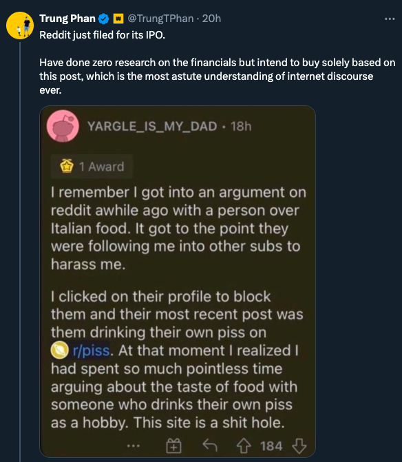 While the YouTubers are grateful for their jobs, there is a psychological cost for dealing with a large audience, constantly adapting to the algorithm, chasing metrics, getting ripped off and always thinking about “content”. I’m not remotely on the scale of these creators but have felt the psychic costs of spending way too many hours on the toilet cranking out memes for internet consumption (yes, I realize that I just put the words “toilet” and “consumption” in the same sentence).