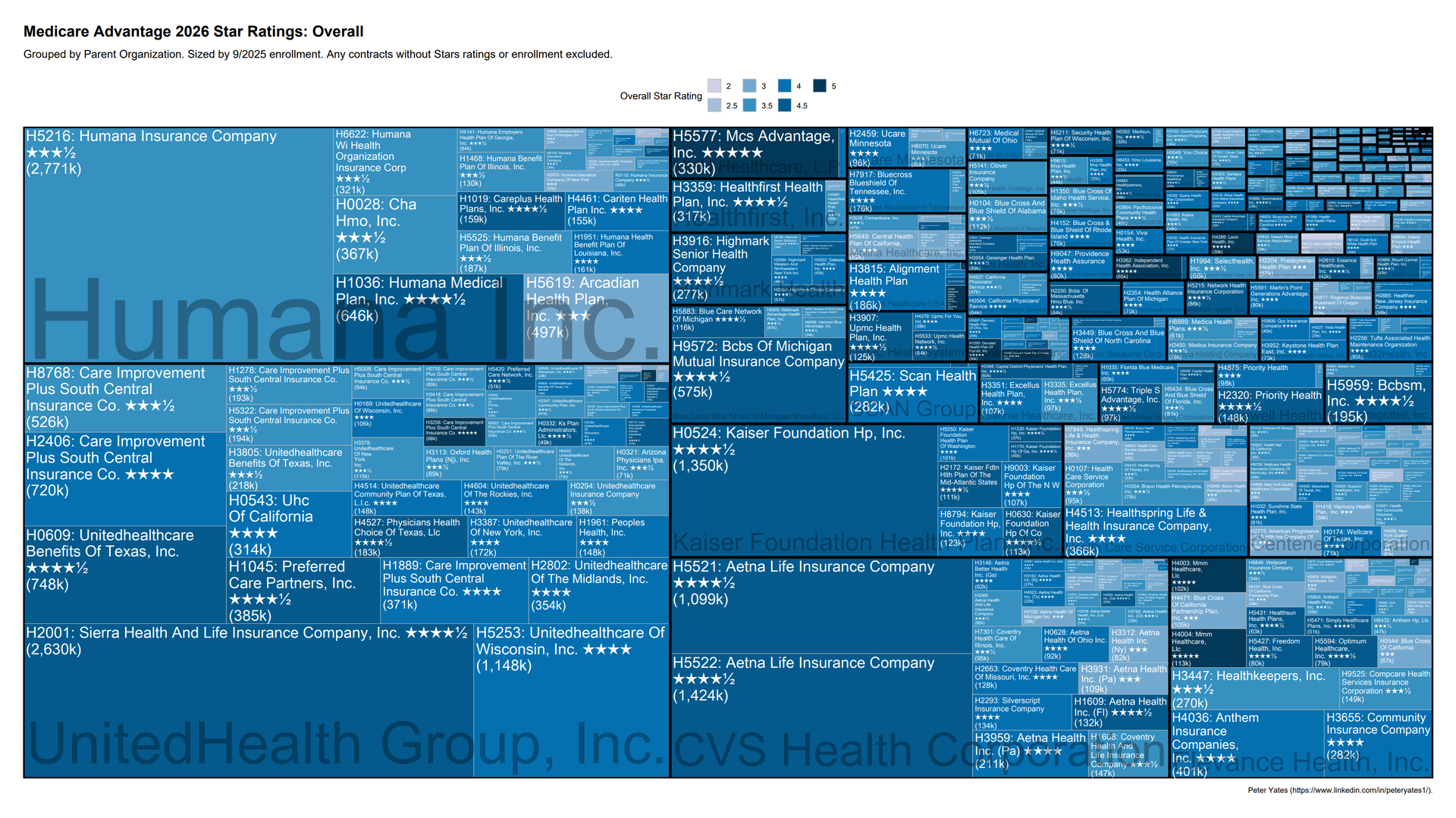 First off, I would highly recommend following Peter Yates for his wonderful visualizations of all things MA star ratings (released last week here) like the tree maps below. Find his posts here. He often highlights the results for each managed care player’s outlook on stars for the upcoming year. Overall, star ratings have declined and since stabilized after CMS tightened up the scoring post-pandemic (leading to certain lawsuits you’re all probably familiar with). Here’s a good overview from Healthcare Dive on winners and losers. Clover continues to complain about having to play the game by the same rules as everyone else instead of coming up with fake metrics like normalized MLR every quarter (though they do have a point about star ratings methodologies).