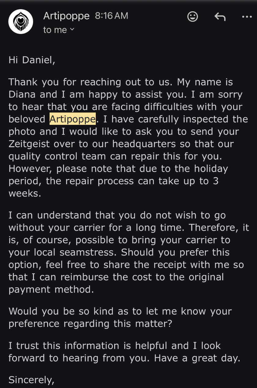 Tonight we'll discuss a life lesson brought to us by Artipoppe. That life lesson, summarized, is to give people options when things go wrong. Here's what happened when my husband wrote customer service about our broken carrier that we used 1x before it broke (a black elastic snapped and said black elastic is critical.) |