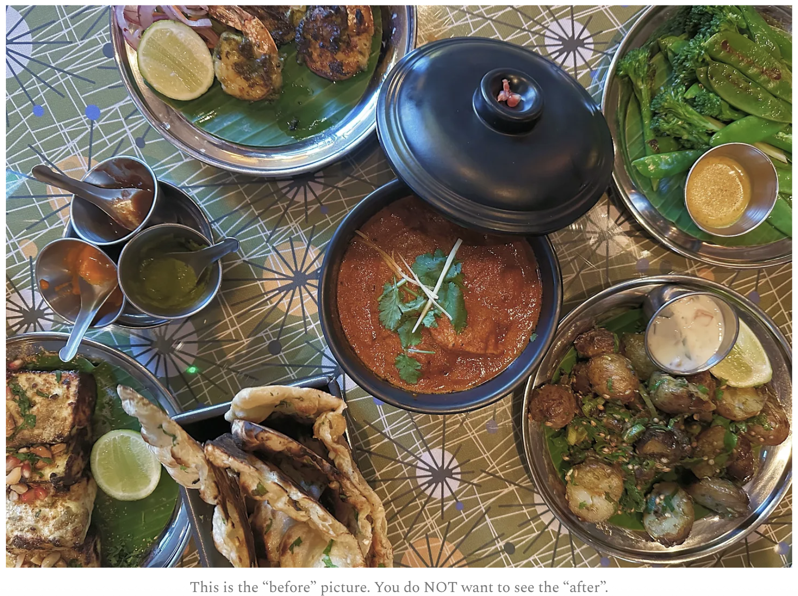 I snapped this image below before absolutely destroying the meal (including one bite where I wrapped the grilled paneer and a masala prawn inside of a garlic naan and dipped it repeatedly in ruby curry sauce). |