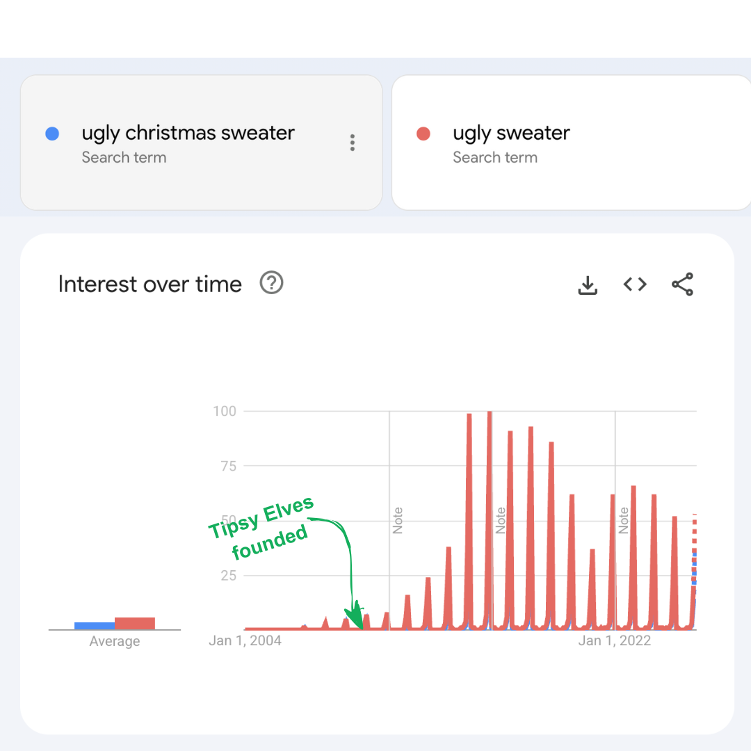 In 2011, irony ruled. Maybe the best example of this trend was the rise of âUgly Christmas Sweater Parties,â especially on college campuses. Enter: Evan Mendelsohn, an unhappy corporate lawyer whoâd taught himself SEO and Digital Marketing. While on an SEO gig, Evan noticed âugly Christmas sweatersâ and other related terms surged every Q4 in Google trends.
