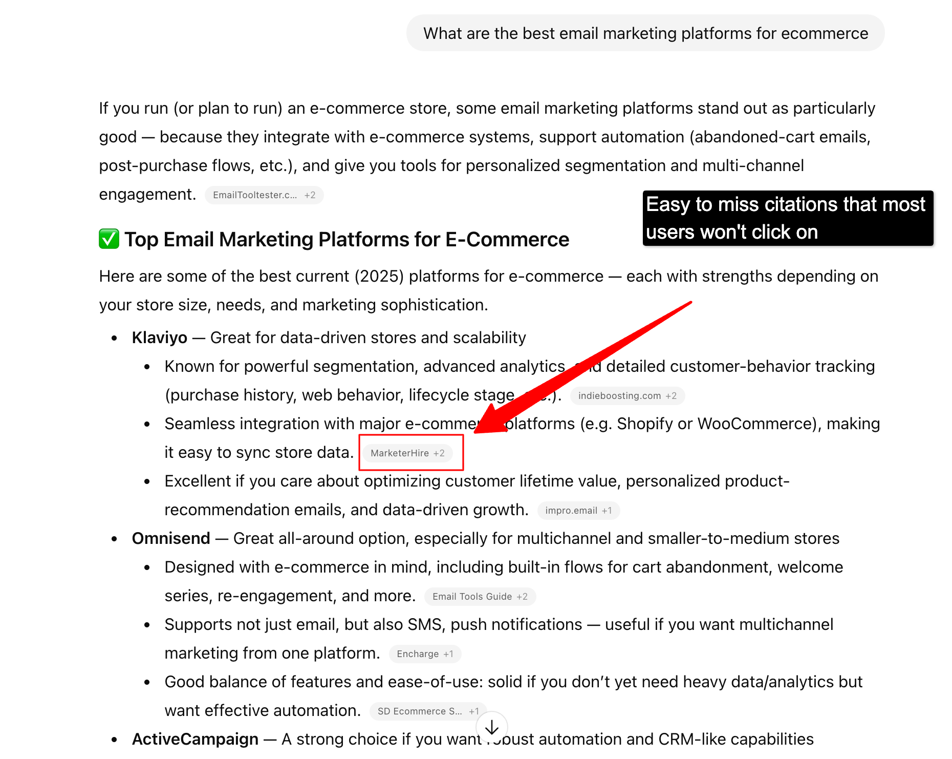 After all, it’s about visibility and, on social platforms at least, engagement. It’s a brand play, sure, but it goes deep in the funnel, too, as more and more people lean on conversations (with other humans or now with LLMs) to inform their buyer’s journey, not just listicles, analyst firms, or comparison tables. Zero-click content as a concept is now making its way into SEO via AEO (or GEO, if you prefer). LLM citations are small and easy to miss. |