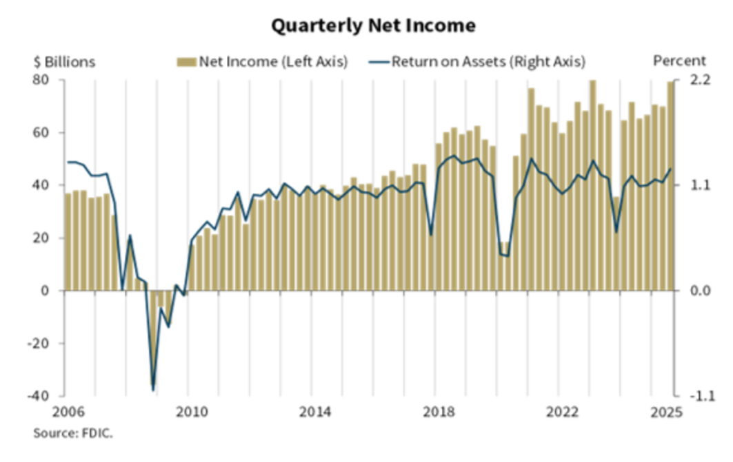 The third quarter wound up being another good quarter for the banking industry, according to the Federal Deposit Insurance Corp. Net income for the quarter was up 13.5% from the second quarter, to $79.3 billion, driven by net interest income growth and declining provision expense tied to the Discover Financial Services acquisition by Capital One Financial Corp.