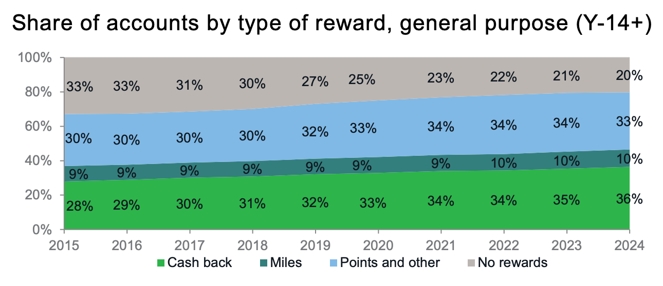 And finally, the share of no-reward credit cards (which are most common for subprime and near-prime segments) has plummeted, as reward credit cards (particularly cash back cards) have surged in popularity.