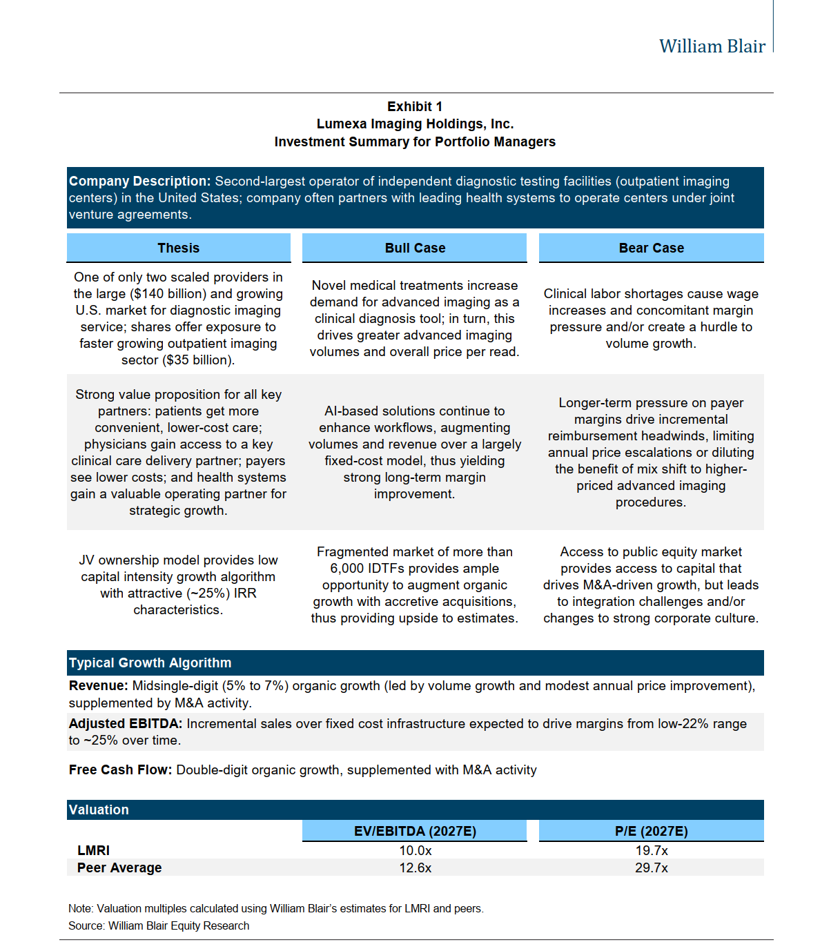 From JP Morgan: “We believe that LMRI possesses an intriguing growth story supported by favorable demand and positioning among patients and payers given the advantages to hospital-based settings for cost, convenience, and specialization as a patient-centric "focused factory" within diagnostic imaging. We believe the company's go-forward strategy to scale operations through de novo builds layered with strategic M&A is a compelling growth opportunity given potential upside, particularly under the company's differentiated JV-structured partnerships with existing health systems that should facilitate more favorable market density additions and new entry due to benefits across reimbursement and referrals. We also believe LMRI's existing scale, embedded earnings from ramping de novos, and focus on advanced modalities should support organic growth efforts in the near-term, with potential downstream benefits to operating leverage from AI/automation. With the broader market for outpatient diagnostic imaging growing in the ~MSD%, we consider growth expectations for LMRI to be reasonable and afford mgmt latitude for upside from continued expansion as the company de-leverages.”
