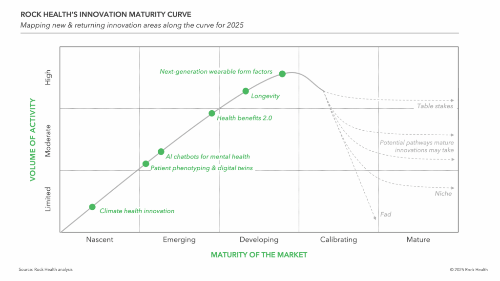 Rock Health shared their state of health tech innovation report near the end of 2025 and it’s always a worthwhile investment of your time. This year Rock Health noted several sectors and technologies and their opinion of where those sit on the innovation maturity curve. |