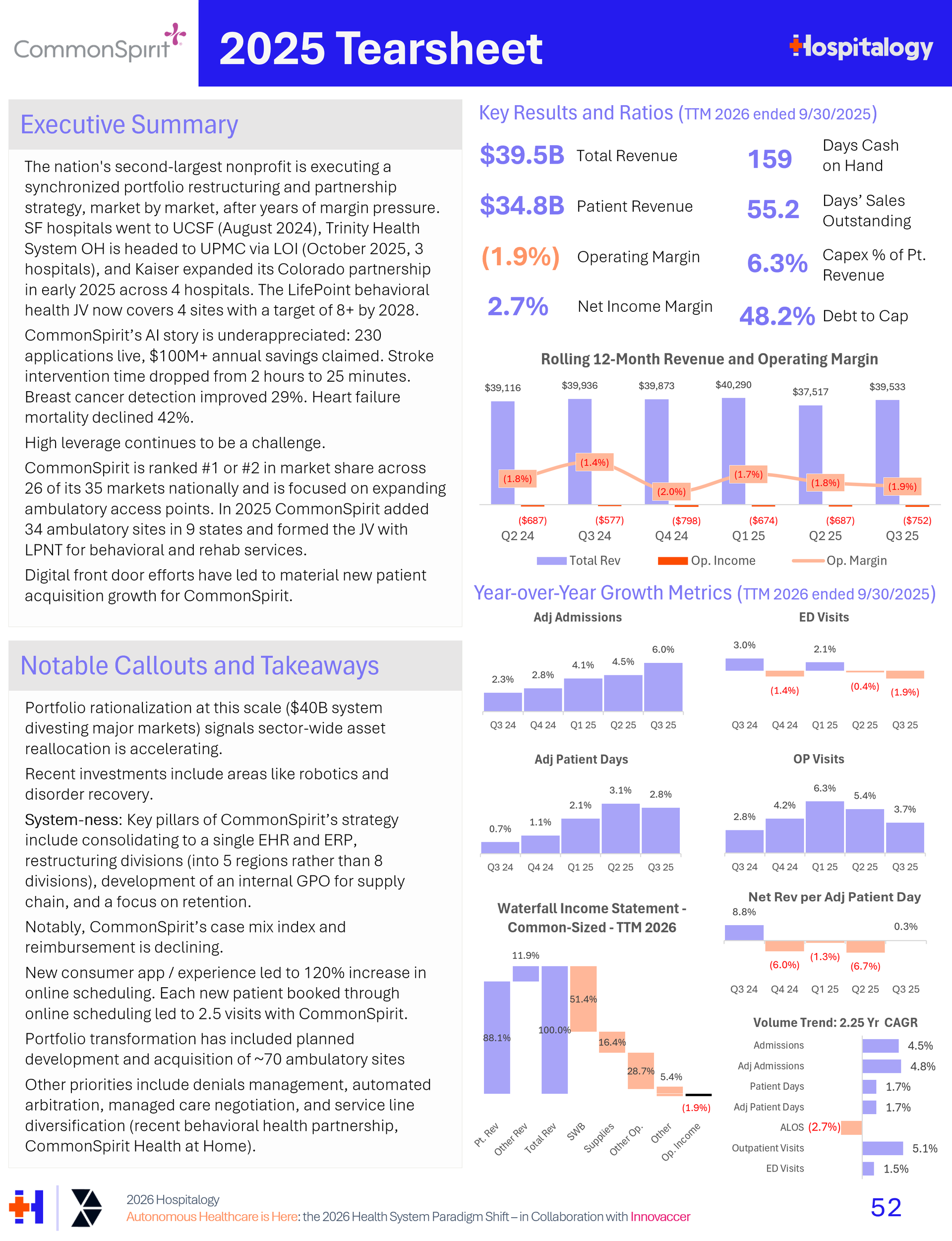 Tear sheets (like CommonSpirit’s below) with executive summaries and pertinent data on major, select health systems