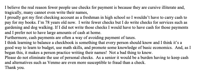 It’s not solely banks’ fault that billions of checks are still flying through our financial system. But I still wonder what banks could do to help their check-using customers migrate away from them. What concerted efforts are banks taking to wean their customers away from checks, explain their vulnerabilities and price the payments to incentivize behavior?