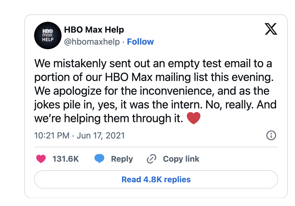 In the HBO example, we all know that intern is going to be okay. We know that the mistake was relatively harmless (an email was sent that said "test" or something if I'm remembering correctly). We know that if HBO says the intern is okay, the intern is going to be okay because A) that's what's right and B) not the place for them to lie. Especially after the amazing response to their heartfelt and hilarious tweet.