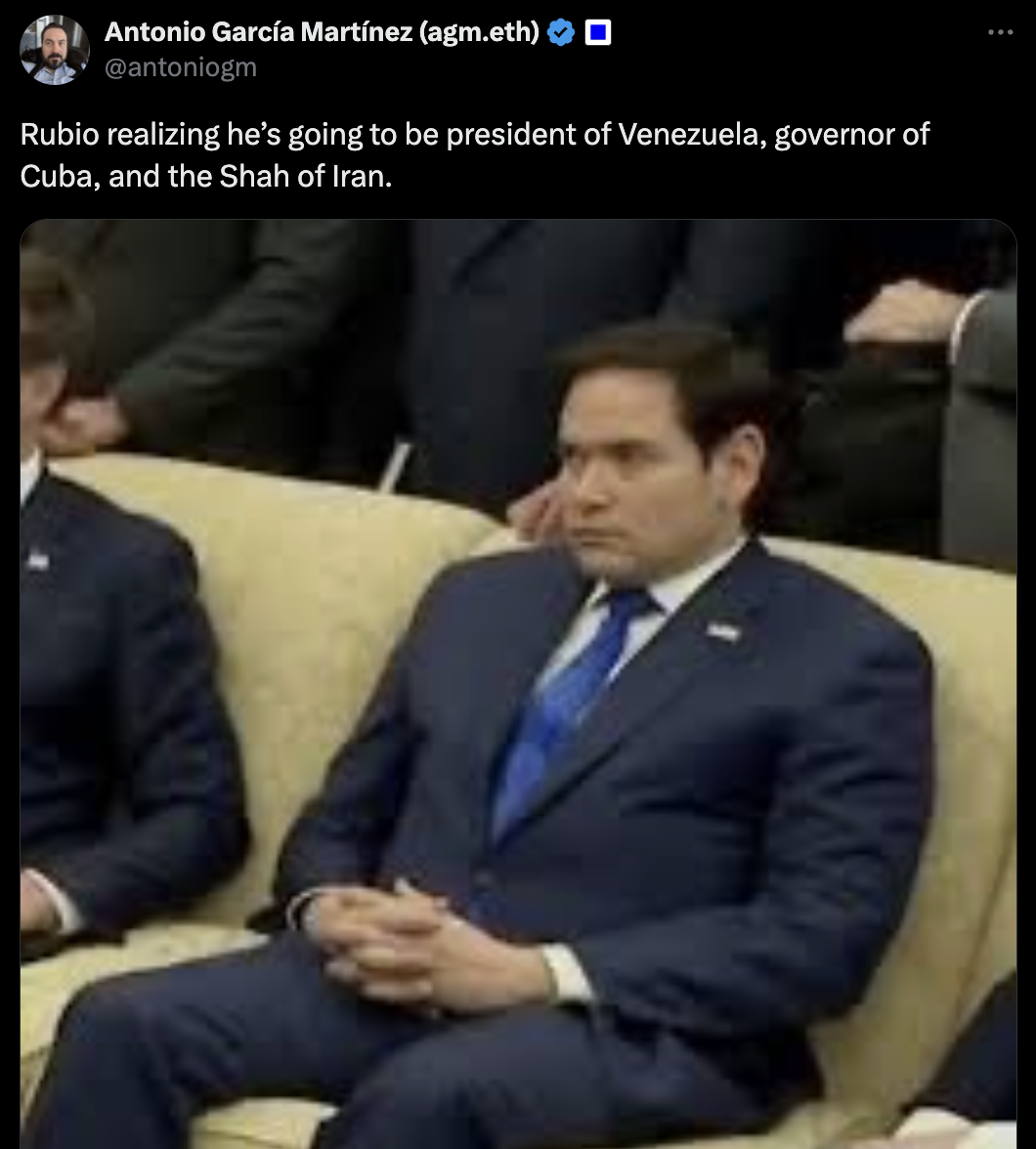 Fast forward to 2026. Rubio is Secretary of State and National Security Advisor. The first person since Henry Kissinger held both roles under President Richard Nixon in the 1970s. In other words, Rubio is wearing a lot of hats right now. And he was given more hats as it looks like Rubio played a pivotal role in recent actions in Venezuela and maybe Cuba, Colombia and [Insert Latin American country]. |