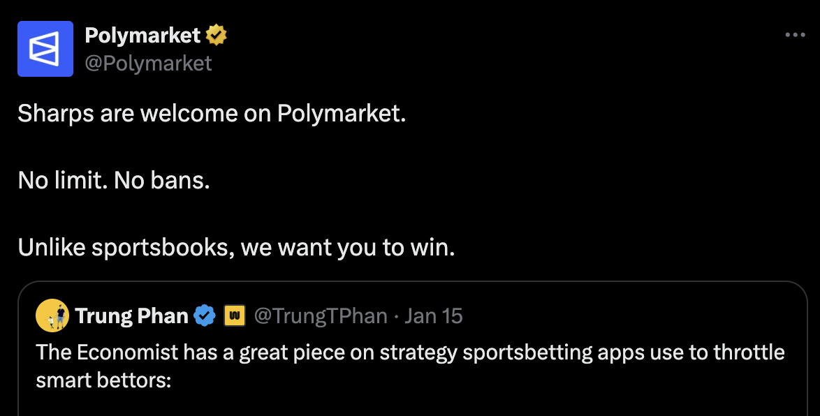 Ideally, sports betting is 10-20% of prediction market volume instead of the 80-90% where it’s heading towards (separately, there have been prediction market issues around insider trading and the way that bets get resolved). While the prediction market-to-sportsbook trend isn’t ideal, it is probably better than the default situation: existing sports betting apps (FanDuel, DraftKings) are just straight up gambling machines — in your pocket — that are actively hostile to their users. Prediction markets are peer-to-peer platforms and make money by taking a commission on the trading volume. Conversely, sports betting apps are the “house” and are pitted against the players. Their business model rely on problem gamblers and making sure smart bettors aren’t allowed to bet. The Economist recently had a great piece on how hard sportsbooks throttle good players and it is packed with wild details: - Skilled players are called “sharps” and given “stake restrictions” if they play too well (bets are capped).