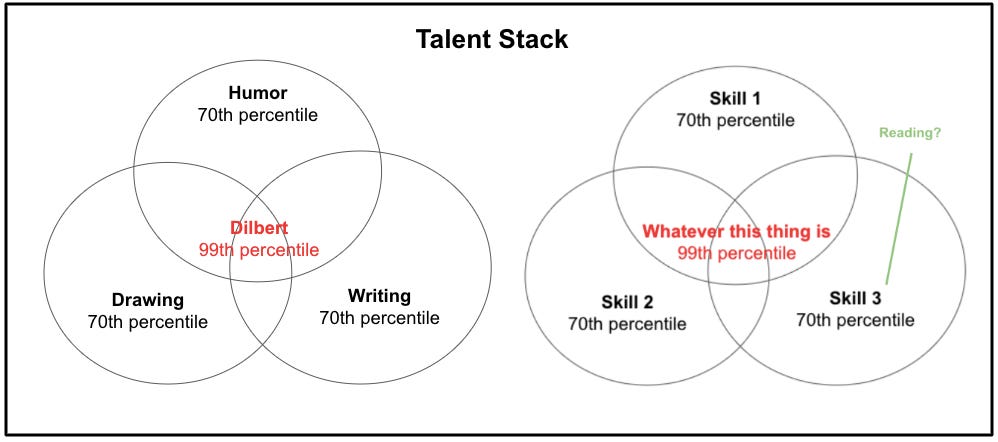 Reading and comprehension are skills. In an increasingly digitally distracted world, fewer and fewer people are honing these skills. This presents a huge opportunity for those who want to build a niche 99th percentile talent stack by combining reading — and the insights gained from the experience — with a few other skills. |