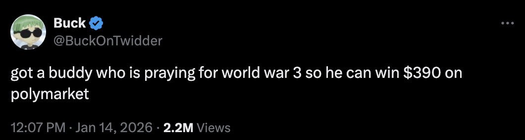 Kalshi and Polymarket — the two main prediction markets — are each valued at $10B+ while trading volume hitting ~$50B last year (by 2030, that figure could reach $1T). The promise of these platforms is that they become “real-time news” on various political, economic, cultural and geopolitical events. A new way to uncover truth. I think that mission is very valid.