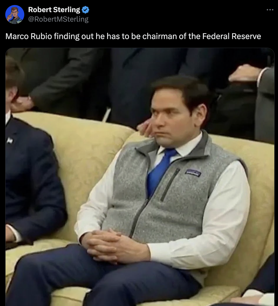 Back to the memes, the quote interactions on Powell’s post (~90m views rn) were absolutely out of control including here, here and here…and it was an ideal setup to bring back Rubio…and I think this format may still have some legs.