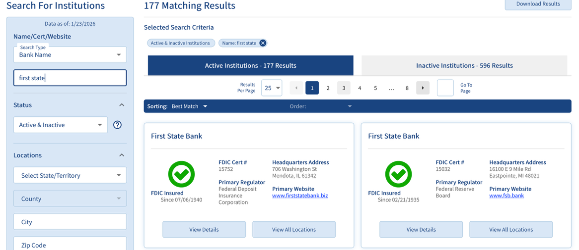 There are more than 4,000 banks, which means they sometimes have similar names to other banks. For instance, there are 177 results for banks that have “First State” in their name, which I do promise to write about someday. |