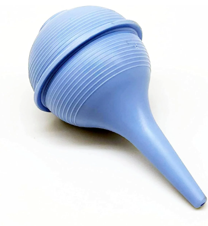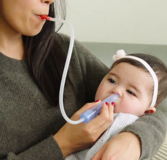A nasal aspirator made of 2 parts: A tube that goes outside a baby’s nostril, connected to a straw that goes inside…a parent’s mouth. |