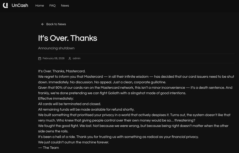 “No KYC” crypto spending cards are an instructive example. These products, which exploit a compliance loophole for corporate cards, have received scrutiny in recent weeks thanks to the reporting of Jason Mikula. And that scrutiny has led to the abrupt shutdown of some of these products, such as UnCash: