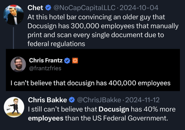 I’m just saying, “Docusign, I’m sorry for laughing at all those Why Does Docusign Have 7,000 Employees memes. It makes a lot of sense and a one-person AI startup isn’t going to replace you.”